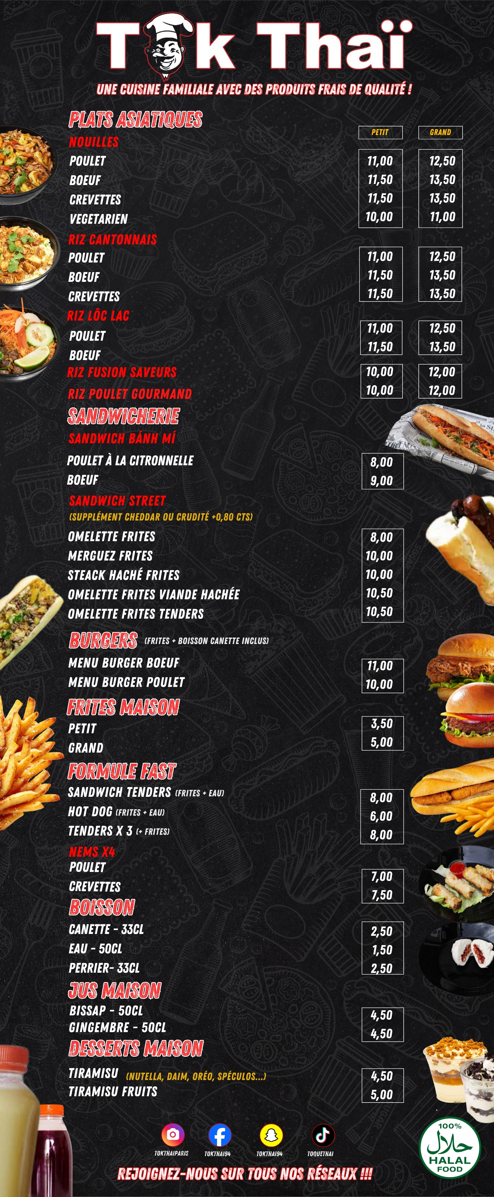 Votre restaurant asiatique incontournable à Vitry-sur-Seine. Cuisine familiale, 100% fait maison et artisanale. Viandes fraîches certifiées HALAL. Plats variés et délicieux desserts à prix imbattable. Le meilleur du goût et de la qualité pour un voyage culinaire unique. Goûtez la différence TOKTHAI.